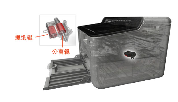 采用在機(jī)身內(nèi)置兩個(gè)輥軸,分別為撮紙輥和分離輥,讓紙張?jiān)谧呒埖倪^程中,大大降低由于多頁(yè)進(jìn)紙而造成的卡紙的機(jī)率。