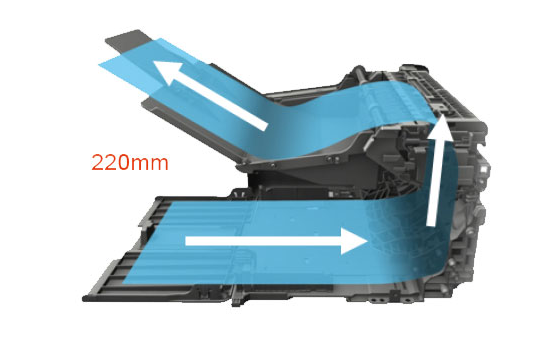 紙張的走紙通道從通常的450mm縮短至220mm,使打印更順暢、更快捷。