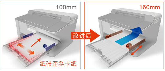 導(dǎo)塊從100mm增長(zhǎng)至160mm,確保紙張從走紙直至打印引擎都能平整,減少紙張歪斜的煩惱。