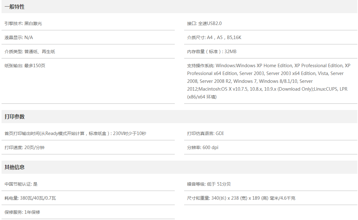 高達(dá)20頁(yè)/分鐘的打印速度,使您的文檔輸出迅速快捷;高達(dá)600dpi的打印分辨率,打消您打印質(zhì)量不佳的顧慮。